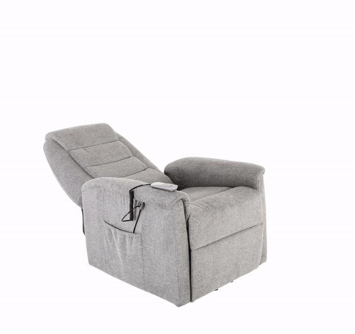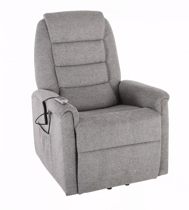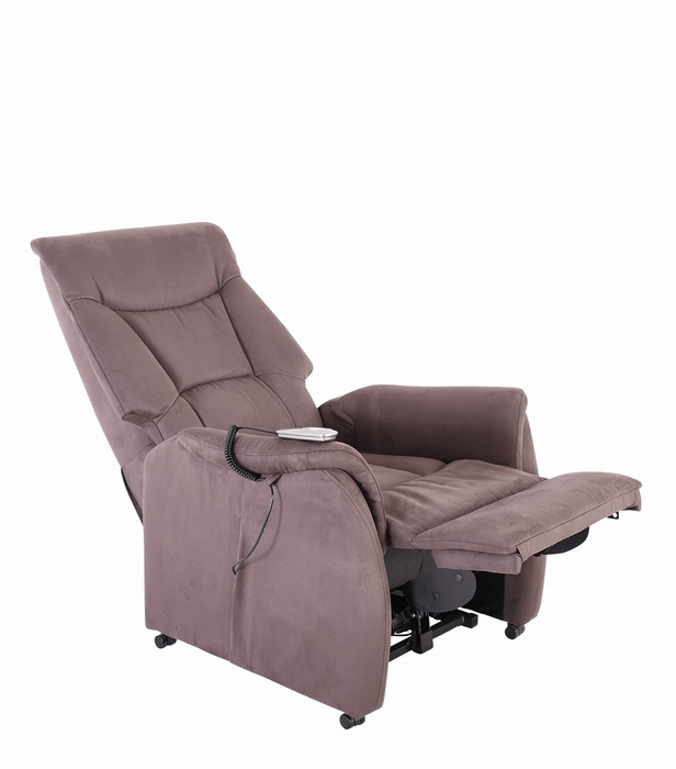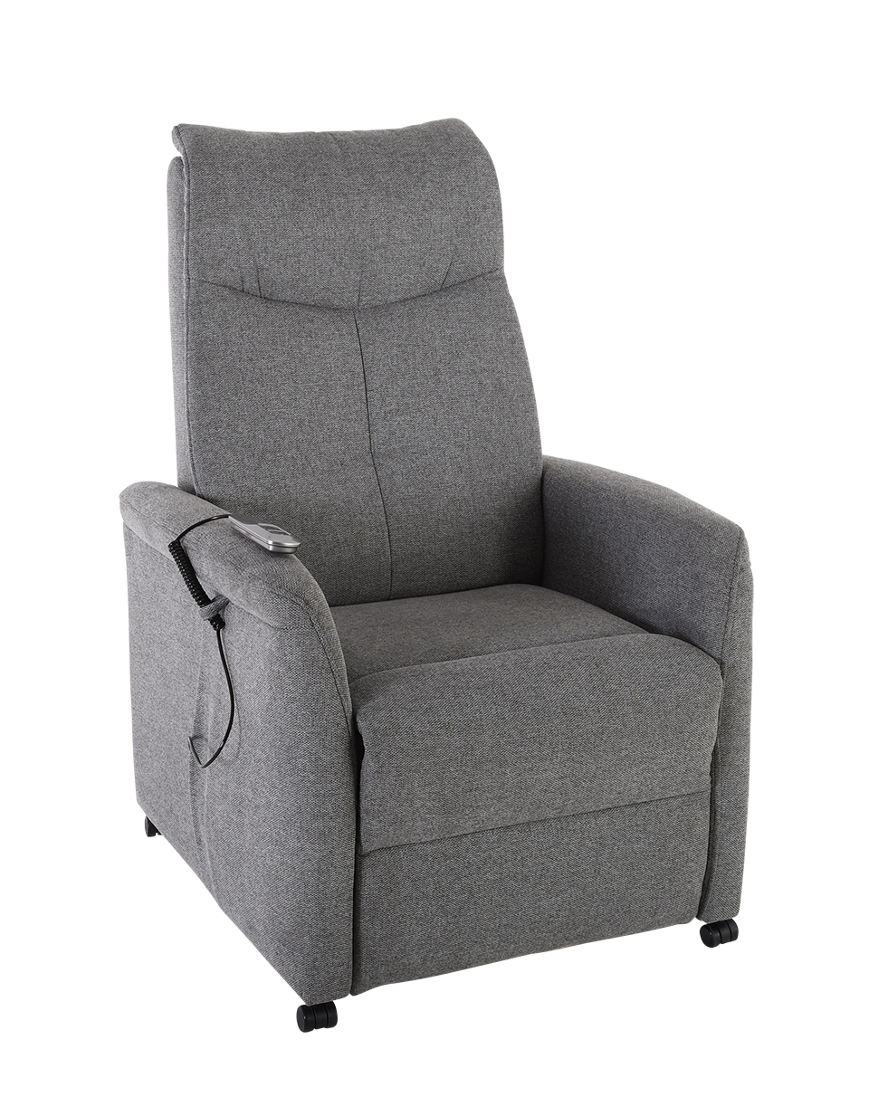 Bezug Webstoff, 95% Polyester, 5% Nylon, Polsterung Stahlwellenunterfederung und Schaumstoff, inkl. motorischer Aufstehhilfe, motorischer Kopfteilverstellung, Relaxfunktion und Fernbedienung, Füße Rollen schwarz, B/H/T ca. 77x112x86 cm.