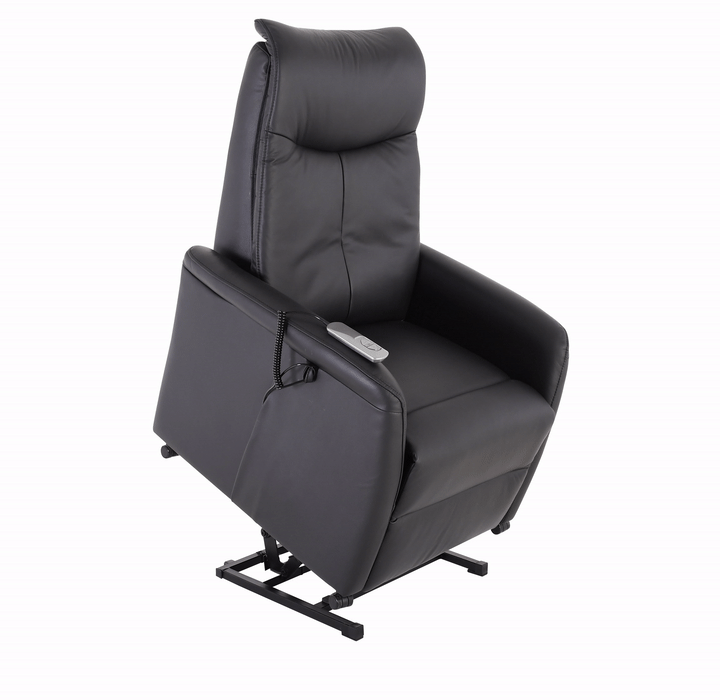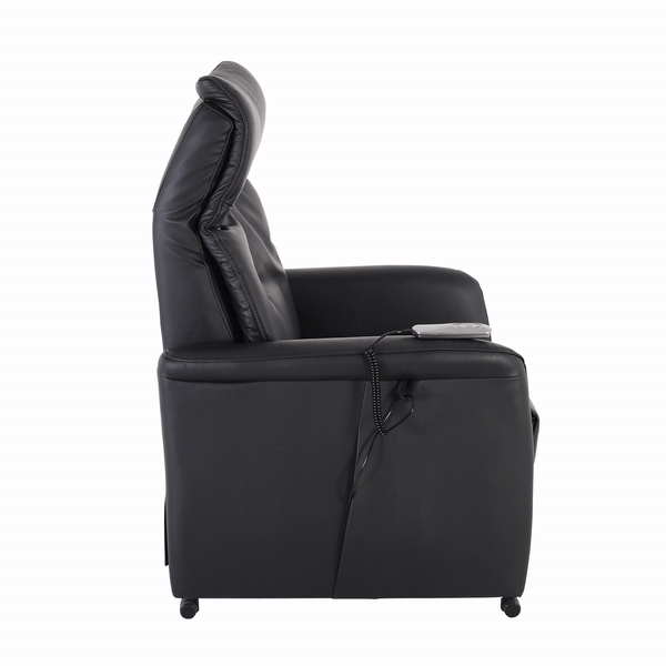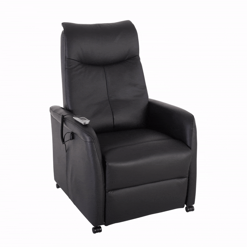 Bezug Sitz, Rücken und Armlehne Leder schwarz, Rücken und Seiten Kunstleder schwarz, Polsterung Stahlwellenunterfederung und Schaumstoff, inkl. motorischer Aufstehhilfe, motorischer Kopfteilverstellung, Relaxfunktion und Fernbedienung, Füße Rollen schwarz, B/H/T ca. 75x113x87 cm.