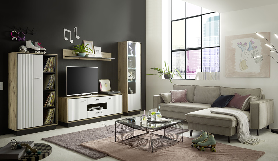 Ob als Wohnwand flexibel zusammengestellt oder einzeln platziert – die Widela Kollektion ist wunderschön und zusätzlich funktional. Du kannst alles blicksicherverstauen – so sieht Dein Wohnzimmer immer ordentlich aus. Das Spiel mit der glatten, hellen Oberfläche und dem Holzdekor macht die Möbel lebendig und gleichzeitig interessant. Hier passt alles zusammen – kombiniere die einzelnen Möbel so, wie es Dir gefällt.